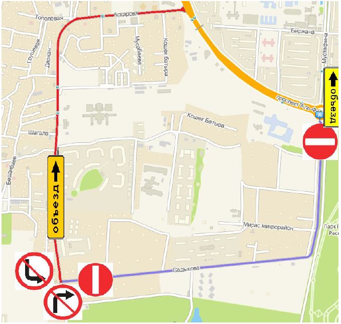 Также в связи с началом дорожно-ремонтных работ с 23 по 24 апреля движение будет перекрыто и по улице Мустафина (Садыкова), от улицы Аскарова до проспекта Аль-Фараби.