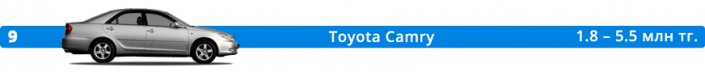 Любимая в стране Camry расположилась на девятом месте рейтинга. На момент публикации на kolesa.kz можно было найти 1 019 объявлений о продаже седана. Речь идет о XV30, которую начали выпускать в 2001 году. В основном встречаются автомобили с 2.4-литровым мотором. Таких насчитывается 76 процентов. Цены варьируются от 1.8 до 5.5 миллиона тенге.