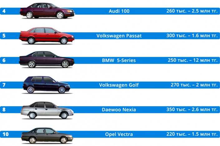 Преимущественно в топе расположились немецкие автомобили, они занимают шесть из десяти топовых позиций. Помимо 124-го, в рейтинг попали Audi 100 в кузове С4 (1 544 объявления), Volkswagen Passat B3 (1 320), BMW 5-й серии E34 (1 257), Volkswagen Golf III (1 175) и Opel Vectra с индексом A (925). Они расположились на 4-м, 5-м, 6-м, 7-м и 10-м местах, соответственно.