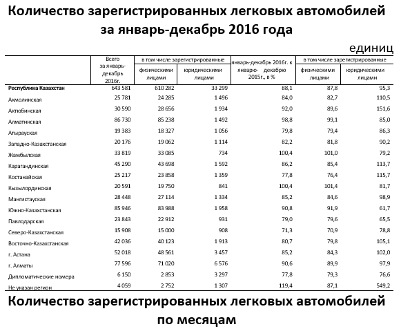 По данным ведомства, за январь-декабрь 2016 года в Республике Казахстан зарегистрирован 643 581 легковой автомобиль, или на 11,9 процента меньше, чем в соответствующем периоде прошлого года. По состоянию на 1 января 2017 года в Республике Казахстан количество зарегистрированных легковых автомобилей составило 3845,3 тысячи единиц.