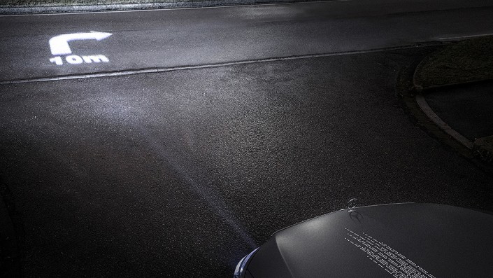 Такие фары могут, например, работать в связке с системой навигации и проецировать подсказки по маршруту прямо перед автомобилем. Например, если необходимо повернуть налево, перед машиной на асфальте появится хорошо различимый указатель.