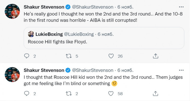 "Я думал, что малыш Роско Хилл выиграл второй и третий раунды. Эти судьи заставили меня почувствовать себя слепым или что-то в этом роде. Он действительно хорош, я думал, что он выиграл второй и третий раунды. И счет 10:8 в первом раунде был ужасен - AIBA все еще коррумпирована!" - написал Стивенсон в Twitter.