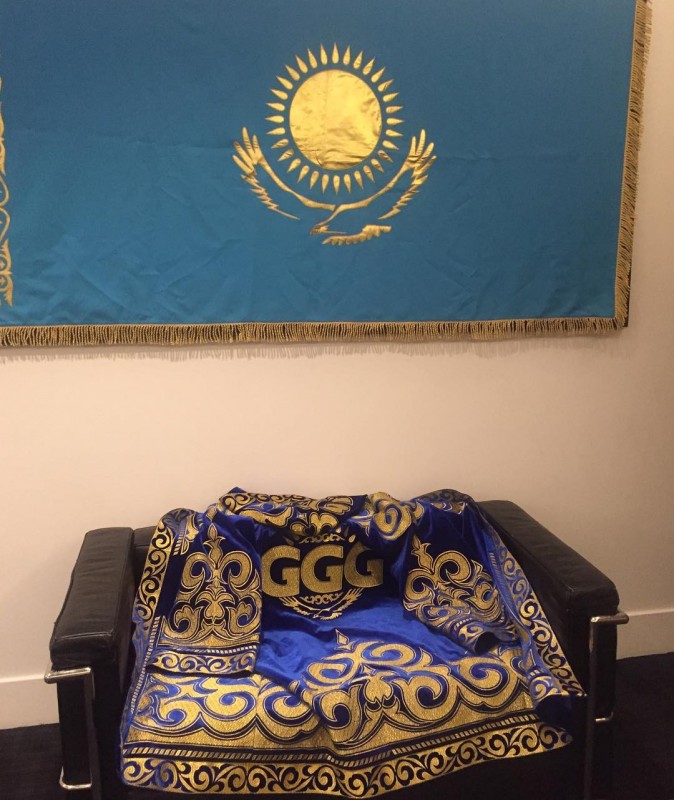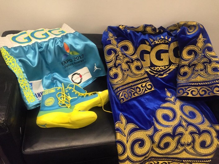 На одном из снимков видны флаг Казахстана и традиционный костюм боксера, в котором он выходит на ринг.
