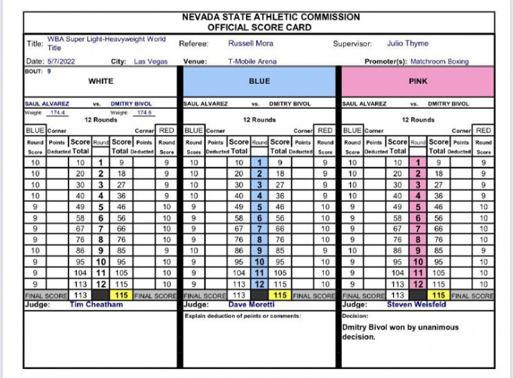 Бивол выиграл единогласным решением судей, 115-113 на всех трех карточках. При этом Альварес забрал первые четыре раунда.