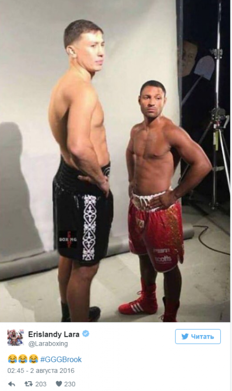 После того, как фото Головкина и Брука появилось в Сети, некоторые пользователи решили потроллить казахстанца за выбор в соперники боксера из другой весовой категории, сделав Геннадия огромным, а Келла - маленьким.