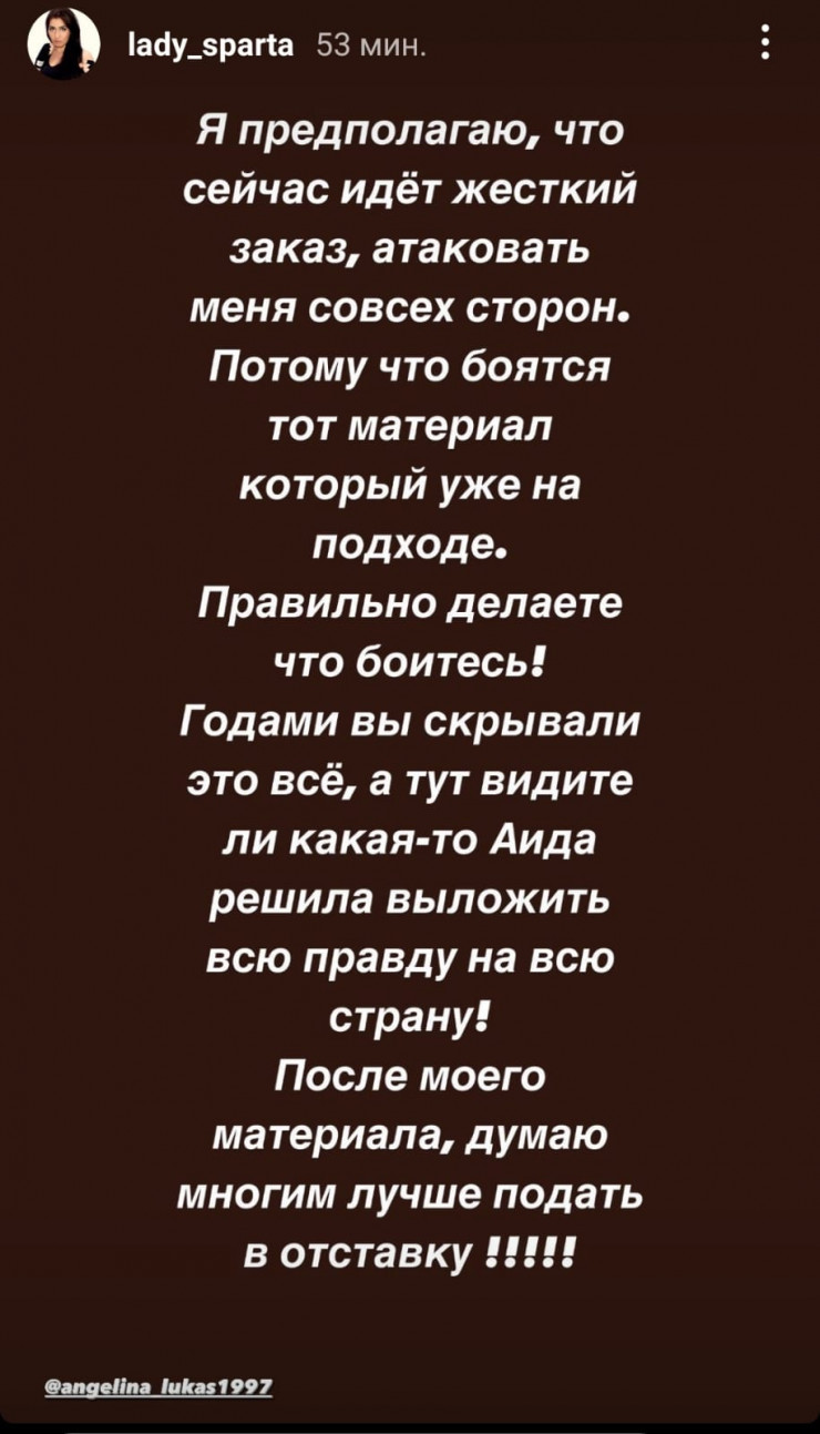 "Я предполагаю, что сейчас идет жесткий заказ атаковать меня со всех сторон. Потому что боятся тот материал, который уже на подходе. Правильно делаете, что боитесь! Годами вы скрывали это все, а тут, видите ли, какая-то Аида решила выложить всю правду на всю страну!