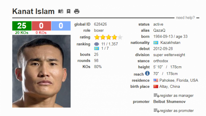 33-летний Ислам перешел в профи в 2012 году. В любителях он становился бронзовым призером Олимпиады-2008, чемпионата мира-2007, чемпионата Азии-2007 и Азиады-2006. Сейчас ему принадлежат второстепенные пояса - чемпиона Северной Америки по версиям WBA-NABO и WBO NABO, а также WBA Inter-Continental.