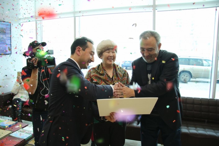 Амангельды Омаров: "Уважаемые Алмагуль-апа и Темирбек-ата! Мы поздравляем вас! Вы стали почетными клиентами компании BI Group. Стало уже традицией, что мы торжественно поздравляем каждого тысячного клиента. Буквально два месяца назад мы здесь вручали подарочный сертификат нашему 20-тысячному клиенту. Благодаря вам наш клуб клиентов пополнился еще на тысячу. Надеемся, ваше доверие к нашей компании будет оправдано, и ваши внуки будут счастливы в новой квартире. Мы вручаем вам подарочный сертификат на паркинг в этом же доме. Надеемся, в будущем мы также поздравим наших 25-тысячных и 30-тысячных клиентов!"