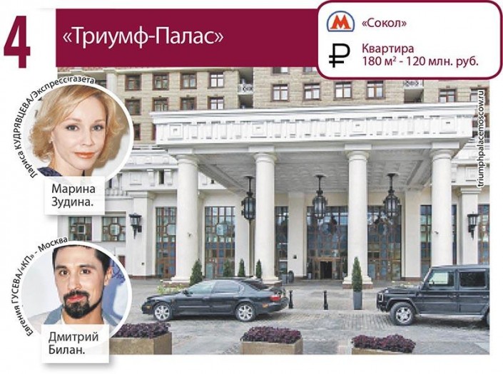 Так, в ЖК "Триумф-Палас" в Чапаевском переулке живут Алсу, Илья Авербух, певица МакSим, Дима Билан, Максим Фадеев и другие.