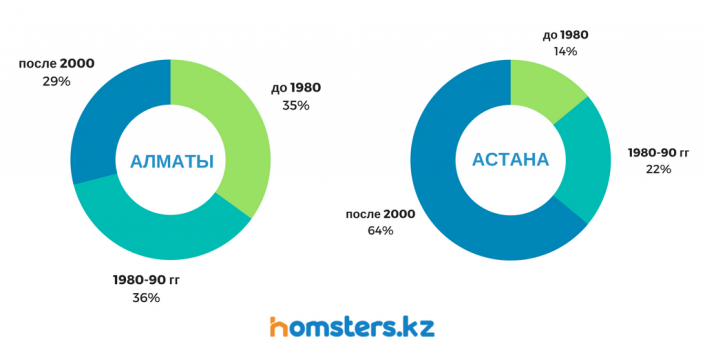В разных городах структура спроса на жилье разных годов постройки отличается, исходя из истории и специфики развития региона. Так, по данным аналитиков, в Алматы на вторичном рынке преобладает спрос на квартиры в домах, построенных в 1980-90-х годах (36 процентов). 35 процентов заявок покупателей приходится на объекты до 1980 года и лишь 29 процентов - на объекты после 2000 года постройки.