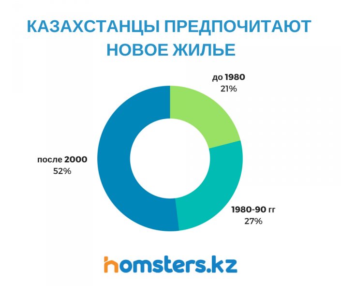 Аналитики подсчитали, что более 52 процентов казахстанцев склонны приобретать "вторичку" в домах, построенных после 2000 года. Спрос на более старое жилье заметно ниже: 27 процентов заявок на покупку "вторички"приходится на объекты 1980-90-х годов постройки, 21 процент - на квартиры в домах, построенных до 1980 года.