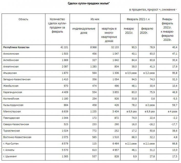 Наибольший рост количества сделок в феврале по сравнению с январем зарегистрирован в Мангистауской области (в 6,9 раза), а также в Атырауской области (3,5 раза) и Нур-Султане (в 2,1 раза).