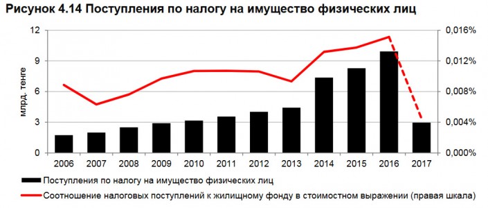 с 2014 года, собранная сумма по данному налогу выросла в 2,1 раза в сравнении с суммарным сбором за 2011-2013 годы. Низкое значение поступлений по налогу на имущество физических лиц в 2017 году объясняется введением в действие изменений в Налоговом кодексе Республики.