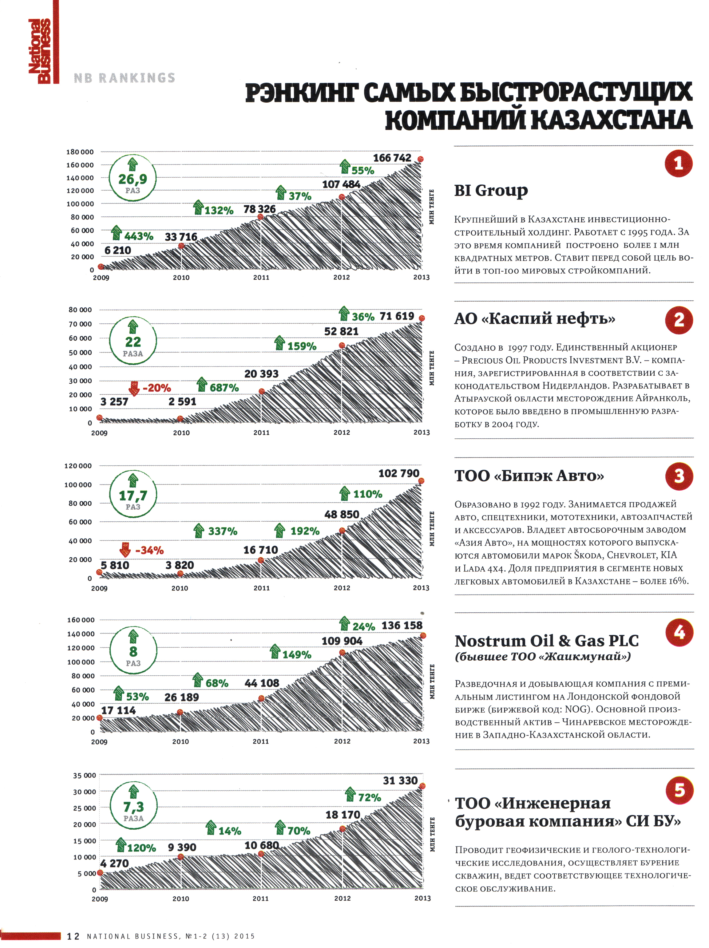BI Group названа самой быстрорастущей компанией Казахстана по версии делового издания National Business. Индекс национального бизнеса рассчитан из соотношения динамики среднего дохода 55 крупнейших компаний страны с динамикой номинального ВВП в текущих ценах. Доход от реализации продукции (работ, услуг) BI Group, возглавившей рэнкинг самых быстрорастущих компаний и показавшей наибольший рост доходов за последние пять лет, вырос в 26,9 раза и по итогам 2013 года составил более 166,7 миллиарда тенге.