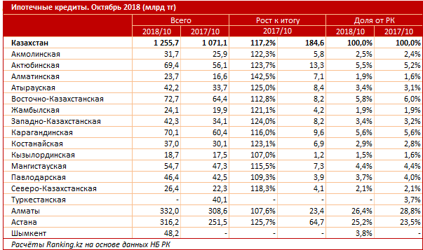 В Алматинской области за год рынок ипотеки прибавил сразу 42,5 процента в денежном выражении. В Астане, Атырауской и Западно-Казахстанской областях объем ипотечных займов через БВУ за указанный период увеличился на четверть.