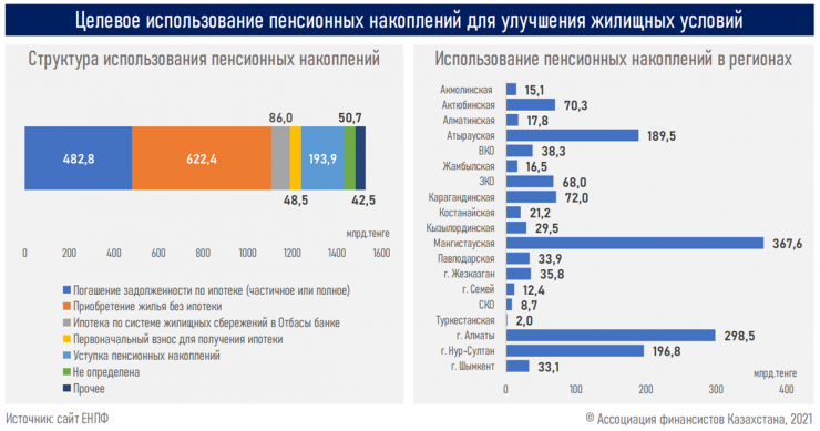 В текущем году рост цен на жилую недвижимость продолжается на фоне изъятий пенсионных средств. По данным ЕНПФ на конец июня 2021 года, на покупку недвижимости и погашение ипотечных займов переведено свыше 1,5 триллиона тенге. Средняя сумма единовременных выплат составила 4,6 миллиона тенге, при этом наибольшее количество выплат отмечено на западе Казахстана - в Мангистауской и Атырауской областях, а также городах Алматы и Нур-Султан", - говорится в публикации аналитического центра АФК.