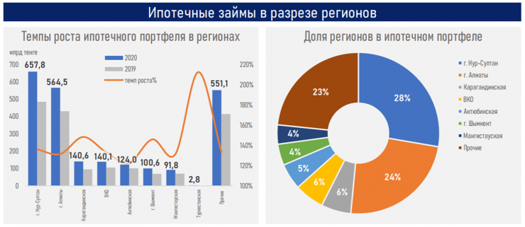 По данным аналитиков, регионы страны имеют неравномерное распределение в портфеле ипотеки, демонстрируя высокую концентрацию в крупных городах - Нур-Султан и Алматы - 52 процента рынка. Четверть рынка ипотеки приходится на Мангистаускую, Актюбинскую, Восточно-Казахстанскую и Карагандинскую области и город Шымкент; в портфеле на долю областей приходится от 4 до 6 процентов. Темпы роста ипотечного кредитования в данных регионах и городах достигали от 23 до 48 процентов в 2020 году.