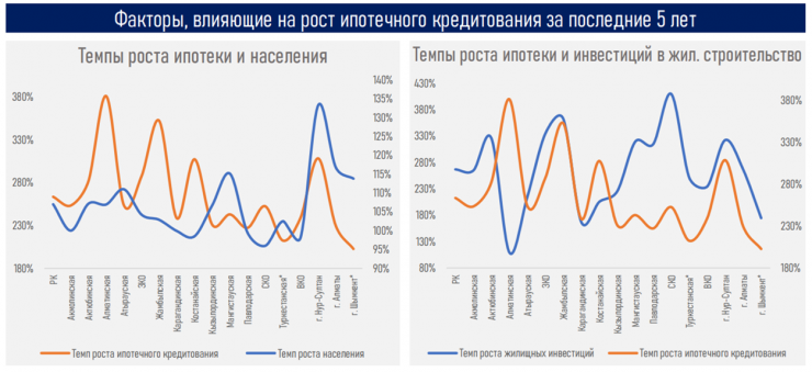 - спрос на ипотеку в регионах страны, помимо государственного стимулирования, обусловлен ростом численности населения (города Нур-Султан и Алматы, а также Мангистауская область) и увеличением инвестиций в жилищное строительство (Алматинская, Мангистауская, Актюбинская и Туркестанская области, а также города Нур-Султан, Алматы и Шымкент).