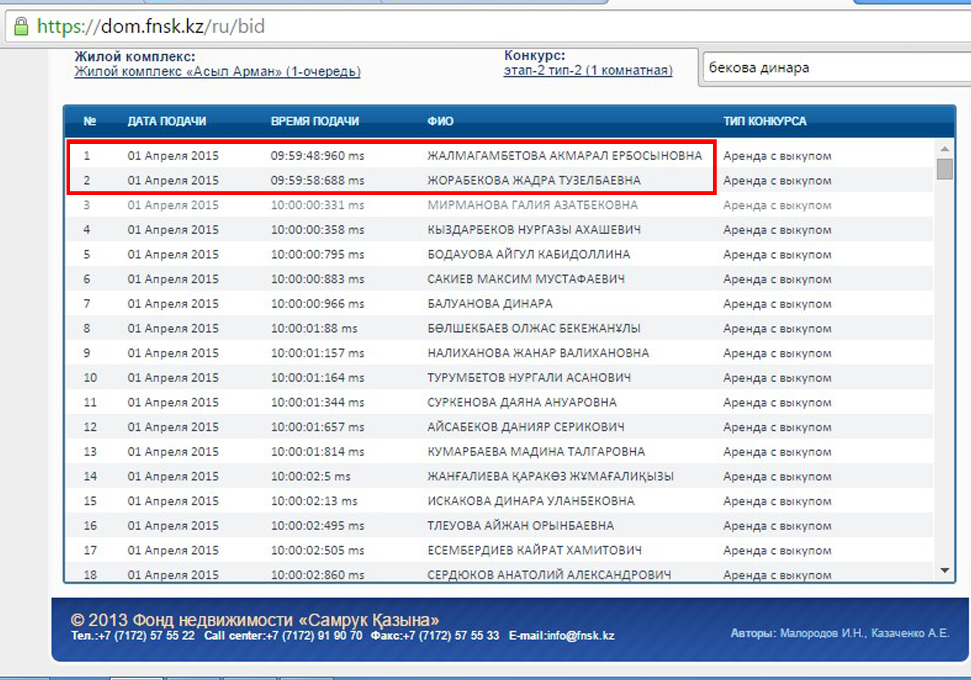 "На портал поступило слишком много обращений и жалоб от казахстанцев о задержках и зависании системы в момент приема заявок. Поэтому все поданные 1 апреля 2015 года заявки на приобретение квартир в "Асыл Арман" аннулируются. В настоящее время все последствия сбоя системы устраняются, проводятся мероприятия по их дальнейшему недопущению. О результатах проводимых работ и новых сроках конкурса будет сообщено на сайте фонда недвижимости", - сообщили в пресс-службе.