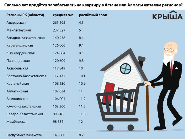 Аналитики сайта "Крыша", используя данные Комитета по статистике РК о средней заработной плате во втором квартале 2016 года, рассчитали, за сколько лет жители различных регионов республики смогут приобрести недвижимость в Алматы или Астане.