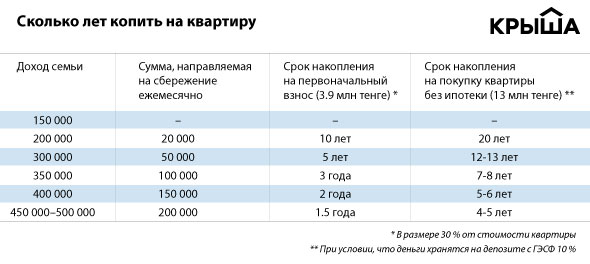 При доходе в 200 тысяч тенге накопить на первоначальный взнос (3,9-4 миллиона тенге или 30 процентов от цены на жилье) можно за десять лет. А срок накопления на покупку квартиры без ипотеки составит 20 лет (при условии, что деньги хранятся на депозите с ГЭСВ десять процентов).
