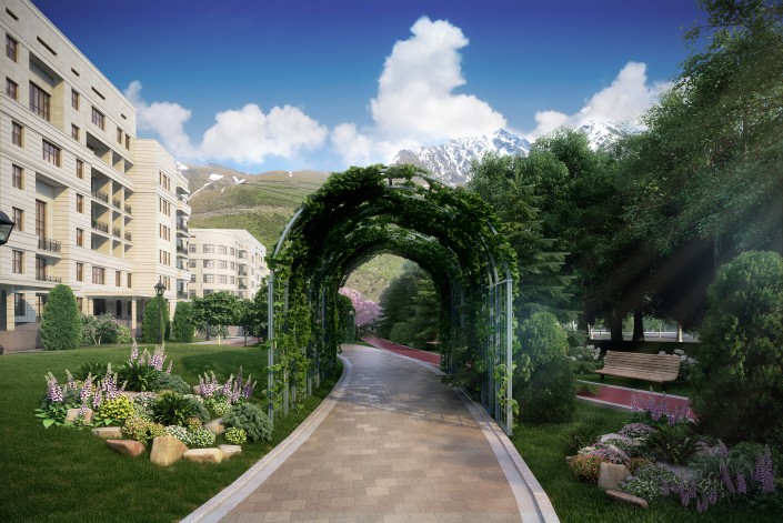 Комплекс площадью в 37 гектаров расположен в предгорьях Заилийского Алатау. Под парковую зону здесь отведен 21 гектар, на которых будут располагаться SPA-центр с олимпийским бассейном, поле для гольфа, водопад и искусственное русло реки, этнографический музей под открытым небом и детские аттракционы. Прогулочная аллея длиной 1 200 метров, опоясанная велосипедными и беговыми дорожками, которые насчитывают вдвое большее расстояние, позволит жителям комплекса совершать ежедневные прогулки и пробежки.