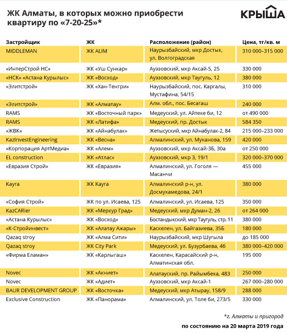 В каких ЖК Алматы продаются квартиры по "7-20-25"