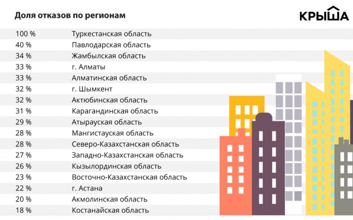 Помимо Туркестанской области, худшие показатели зафиксированы в Павлодарской области (40 процентов отказов от общего количества заявок, по которым принято решение), Жамбылской области (34 процента), Алматы и Алматинской области (33 процента), а также в Шымкенте (32 процента).