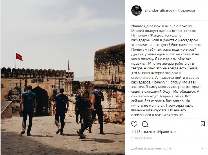 "Раньше я говорил. Мы родились не там! Сейчас я просто скажу, учите язык! Учите английский, французский, немецкий и так далее господа актеры!!! Никогда не поздно учиться!!! Это мой совет! Я выезжаю за рубеж по работе с каскадерами. И всегда на площадке представляю наших. Господа киношники!!! Вы талантливы! Только вы об еще не знаете! Ответ один! Я лучше буду двигаться с қарапайым жігіттермен и реально получать большой опыт!!! Чем парится в одной и той же каше. Вопрос второй. Почему у меня так мало подписчиков?) Может быть и мало. Но за то верные! Умных подростков которые учат меня жить, я сразу блокирую, нахальных школьников тоже, старших пытаюсь успокоить . В итоге остаются такие же люди как и я. Рахмет!" - заключил он.