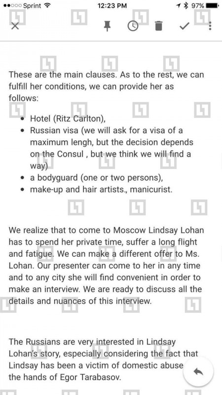 В ответ Лохан выставила список требований, в числе которых гонорар в размере 500 тысяч фунтов стерлингов, номер в отеле "Ритц-Карлтон", круглосуточная охрана, частный самолет для доставки в Москву и обратно, а также годовая виза, парикмахеры и стилисты. Помимо этого, рыжеволосая знаменитость якобы попросила встречу с Владимиром Путиным.