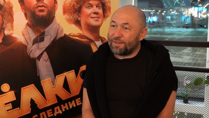Вот как сейчас. Я езжу по России, приезжаю в Казахстан для того, чтобы рассказать зрителям о том, что выходит новый фильм, и о том, что в компании этих замечательных людей я провел год (снова показывает на постер). Вы знаете, в отличие от вас, у меня Новый год длится 365 дней в году, потому что зрители смотрят кино зимой, а мы снимаем его летом, поэтому у нас в июле, в июне Новый год. Мы засыпаем лес снегом, актеры ходят в шубах и шапках в 30-градусную жару, сыпется снег сверху, они делают вид, что им холодно, а потом на монтаже им вставляют компьютерный пар изо рта для ощущения зимы.