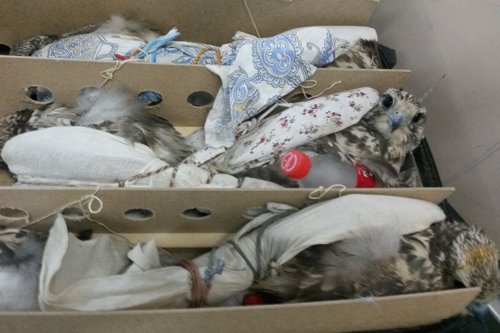 Птиц обнаружили в пункте пропуска Международного аэропорта Алматы на рейсе сообщением Алматы - Доха. При загрузке багажа обнаружены три деревянных ящика, в которых находились 14 особей сокола-балобана, целостность идентификационных колец которых была нарушена.