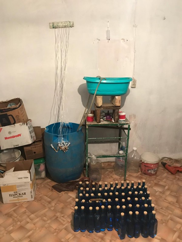 Мужчину, в багажнике автомобиля которого находился алкоголь сомнительного происхождения, задержали 19 апреля. В ходе проведения дальнейшей проверки был установлен подпольный цех, где изготавливали спиртные напитки.