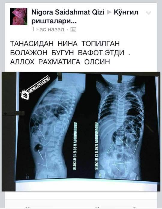 В Ташкенте скончался 11-месячный младенец, в теле которого были обнаружены 16 швейных иголок. Директор Института демократии и прав человека в Узбекистане Сайера Ходжаева написала на своей странице в Facebook, что малышу не удалось выжить после операции по извлечению иголок из его тела.
