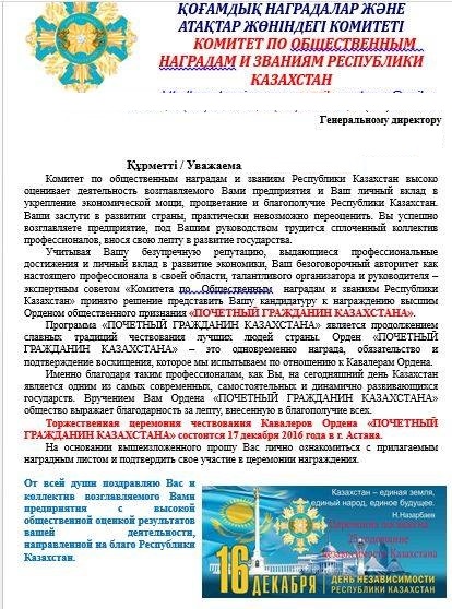В письме говорится, что якобы кандидатура получателя за "вклад в развитие экономики" представлена на соискание премии. При этом, как заявляют организаторы, есть одно "но" - нужно всего-лишь "выложить" от 1,75 до 1,25 миллиона тенге. Подробный "прейскурант" услуг расписан в графе "Информационно-имиджевое сопровождение церемонии награждения орденом "Почетный гражданин Казахстана" 17 декабря 2016 года". В него входит "наградной комплект": орден из серебра и золота, удостоверение "почетного гражданина", часы, кортик, настенная плакетка - памятная или декоративная медаль, имеющая форму многоугольника. Также в "прейскуранте" прописаны встреча в аэропорту, размещение в гостинице, возможность пригласить до двух сопровождающих, экскурсии по Астане на лимузине, концертная программа со звездами, фото-, видеоотчет с мероприятия и размещение отчетов о каждом номинанте на официальном сайте мероприятия.