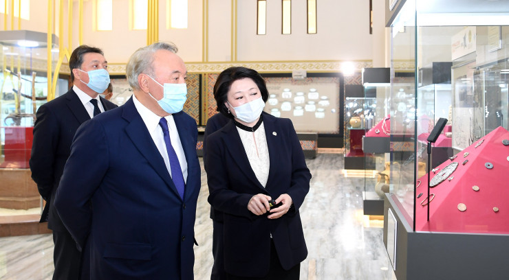 Нурсултан Назарбаев и министр культуры и спорта Актоты Раимкулова на презентации археологических артефактов городища Культобе, 28 сентября 2020 года