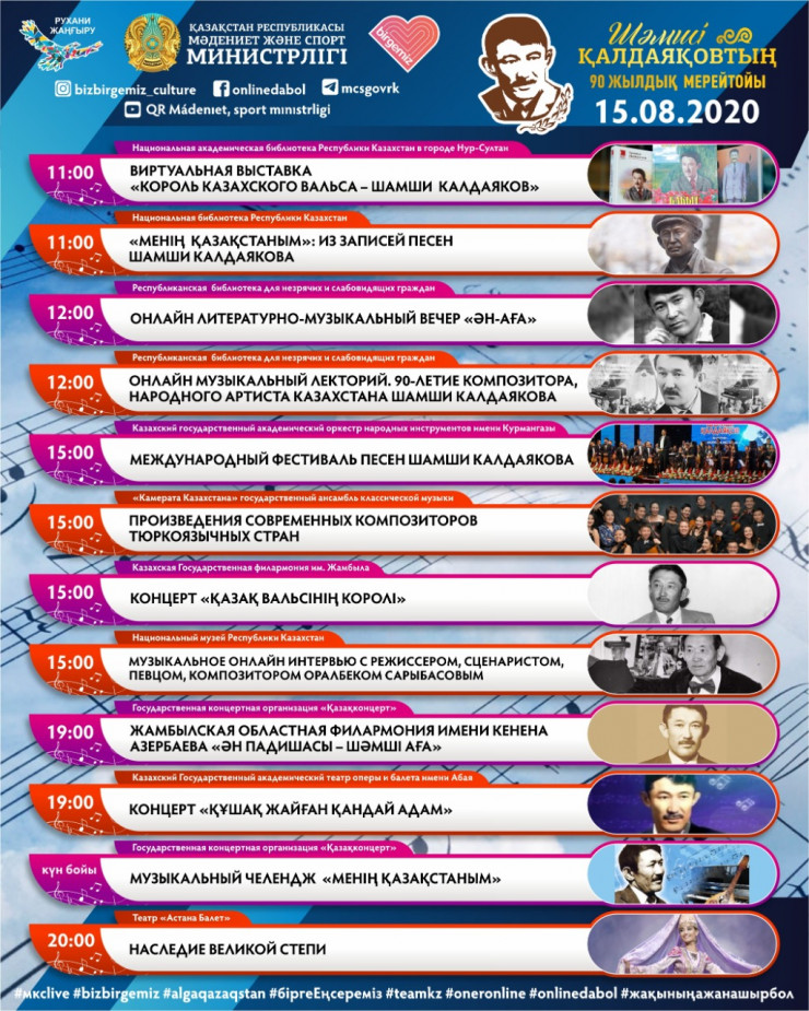 Также 15 августа на официальных страницах Национального музея Республики Казахстан пройдет музыкальное онлайн-интервью о творчестве Шамши Калдаякова с режиссером, сценаристом, певцом-композитором Оралбеком Сарбасовым. Среди зрителей эфира будет организован опрос Muzei Time, посвященный жизни и творчеству композитора.