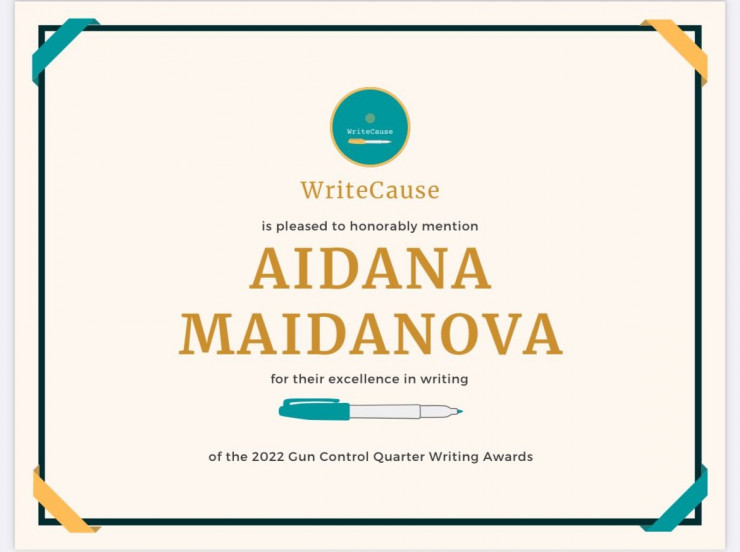 "В совсем юном возрасте увлекалась написанием небольших художественных рассказов, а в последние два года меня стали интересовать мировая политика и экономика. Например, в школе я делала доклад на тему беженцев из Мьянмы, писала работы о палестино-израильском конфликте. Однажды эссе о процессах регулирования огнестрельного оружия в Казахстане так понравилось жюри, что я стала победителем в конкурсе писателей организации Write Cause", - говорит девушка.
