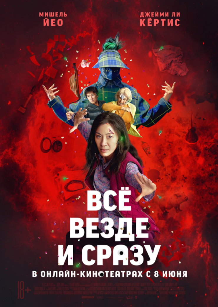 Фильм признан как самый изобретательный и остроумный боевик года. По сюжету, судьба мультивселенной – в руках владелицы прачечной. Главная героиня Эвелин, которая никак не может составить налоговый отчет и разобраться с проблемами в личной жизни, находит вещь, которая помогает ей перемещаться по параллельным вселенным. Теперь она имеет возможность прожить тысячи жизней и стать кем угодно – от известной актрисы до оперной дивы. Главные роли исполнили Мишель Йео и Джейми Ли Кертис, а кинорежиссерами выступили Дэн Хван и Дэниэл Шайнерт.