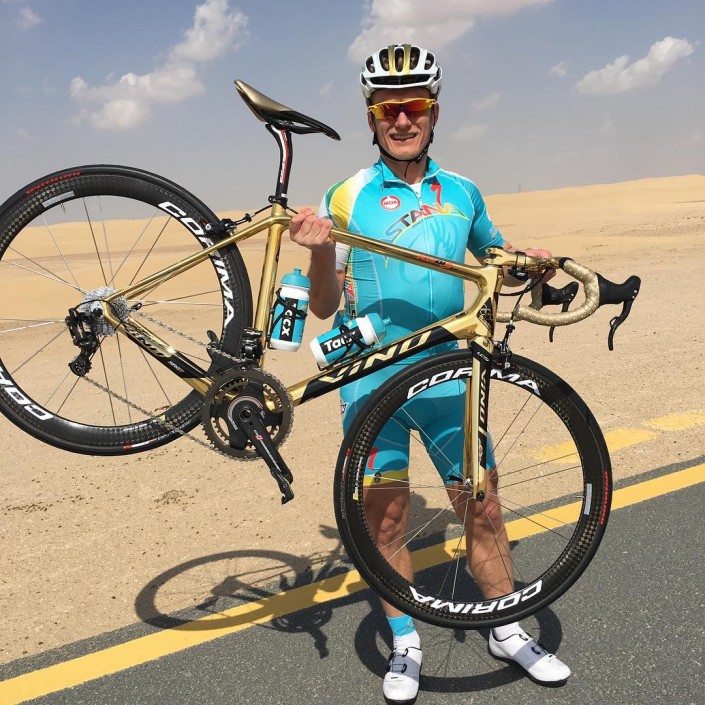"Привез в Дубай свой ​​"золотой" Вино-велосипед! Оснащенный по последнему слову техники, велосипед выполнен в "золотом" обрамлении с красивым казахским орнаментом - полностью ручная работа. Велосипед выполнен в престижной лимитированной серии, посвященной золотой медали в Лондоне. Первый такой велосипед был продан в целях благотворительности для помощи детям-сиротам. Обладать таким велосипедом - это знак особого престижа", - подписал снимок генеральный менеджер велокоманды "Астана".