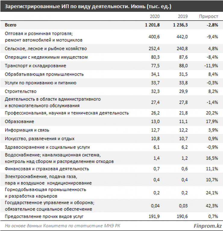 К июлю 2020 года в РК было зарегистрировано 1,2 миллиона индивидуальных предпринимателей - на 2,8 процента меньше, чем в прошлом году.