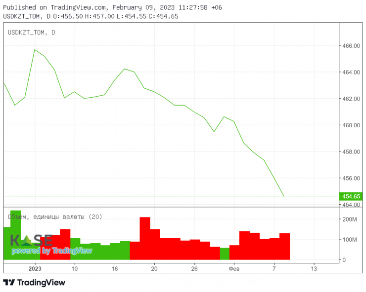 По итогам месяца курс национальной валюты укрепился на 0,5 процента до 460,52 тенге за один доллар.
