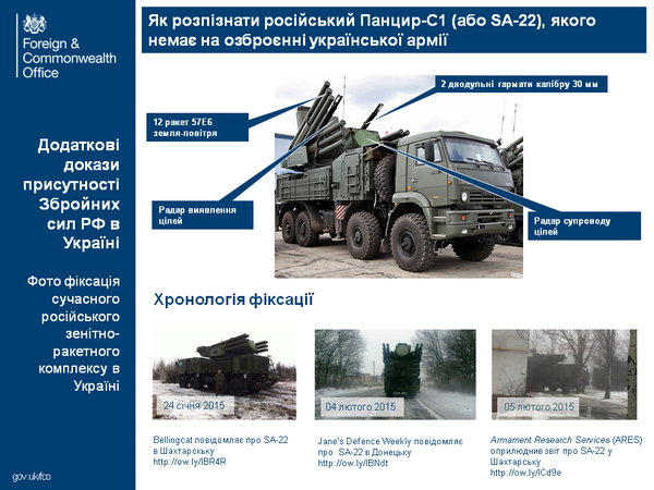 Британские дипломаты обнародовали материал под названием "Как распознать российский "Панцирь-С1", которого нет на вооружении украинской армии". В нем приводятся архивная фотография зенитного ракетно-пушечного комплекса "Панцирь-С1", его описание, три фотографии, ранее появлявшиеся в СМИ, а также приводится хронология, где и когда "Панцирь" якобы был зафиксирован в Донбассе.