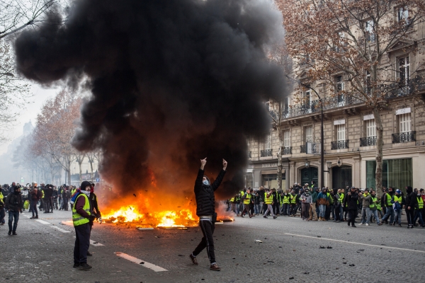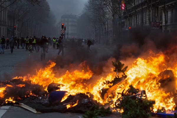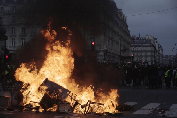 Днем в субботу протестующие начали сооружать баррикады. Люди громят магазины и банки, поджигают машины в центре Парижа.