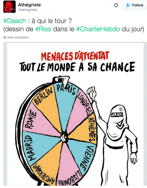 Спустя несколько часов на сайте появилась другая карикатура. На ней изображены разбросанные силой взрыва частей тела и виднеется голова одного из террористов.