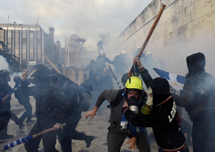 Правительство Греции утверждает, что беспорядки устроили радикальные элементы и члены ультраправой партии "Золотая заря". Анархисты в капюшонах и в противогазах пытались пройти к парламенту. Они забросали камнями и краской полицейских, те ответили слезоточивым газом.