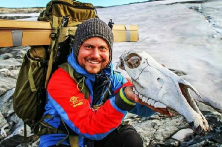 Исследователь держит череп лошади. Фото: secretsoftheice.com.