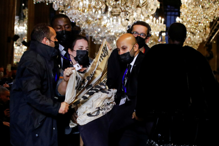 Второй протестующий с аналогичным плакатом пытался пройти по подиуму вместе с моделями в конце показа. Его также вывели охранники.