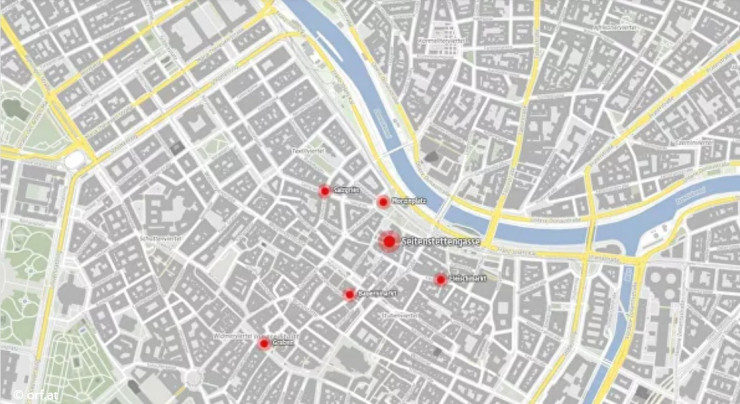 Австрийский телеканал ORF опубликовал карту с местами нападения террористов в Вене.