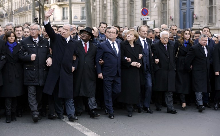 В Париже в шествии приняли участие 1,6 миллиона человек, а том числе около 40 глав государств и правительств. Бок о бок прошли (на фотографии, слева направо): мэр Парижа Анн Идальго, председатель Европейской комиссии Жан-Клод Юнкер, премьер-министр Израиля Биньямин Нетаньяху, президент Мали Ибрагим Бубакар Кейта, президент Франции Франсуа Олланд, канцлер Германии Ангела Меркель, председателя Европейского совета Дональд Туск, президент Палестинской автономии Махмуд Аббас, королева Иордании Рания и король Абдалла II, премьер-министр Италии Маттео Ренци.